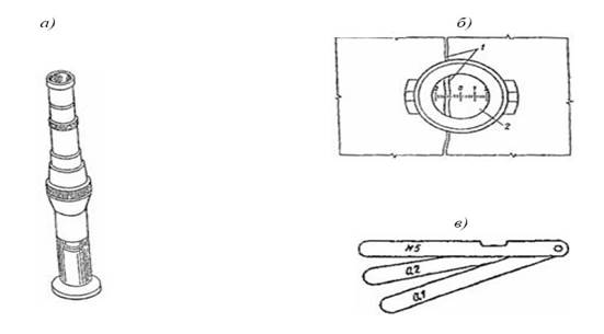 Рис. 1. Приборы для измерения раскрытия трещин а - отсчетный микроскоп МПБ-2, б - измерение ширины раскрытия трещины лупой: 1 - трещина; 2 - деление шкалы лупы; в – щуп
